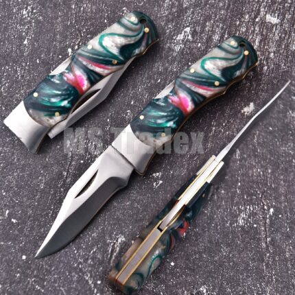 • Handcrafted Back-Lock Folding Knife – Marbled Turquoise & Onyx Resin Handle with Stainless Bolsters Handcrafted Back-Lock Folding Knife – Marbled Turquoise & Onyx Resin Handle with Stainless Bolsters $ 100 Original price was: $ 100.$ 90Current price is: $ 90.pieces