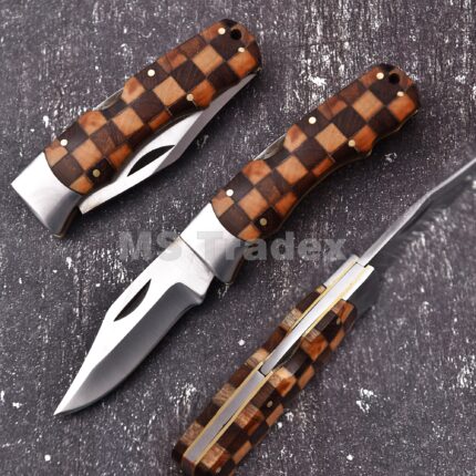 Handmade Checkerboard Mosaic Folding Knife – Natural Walnut & Oak Toned Wood Handle