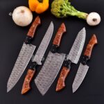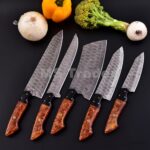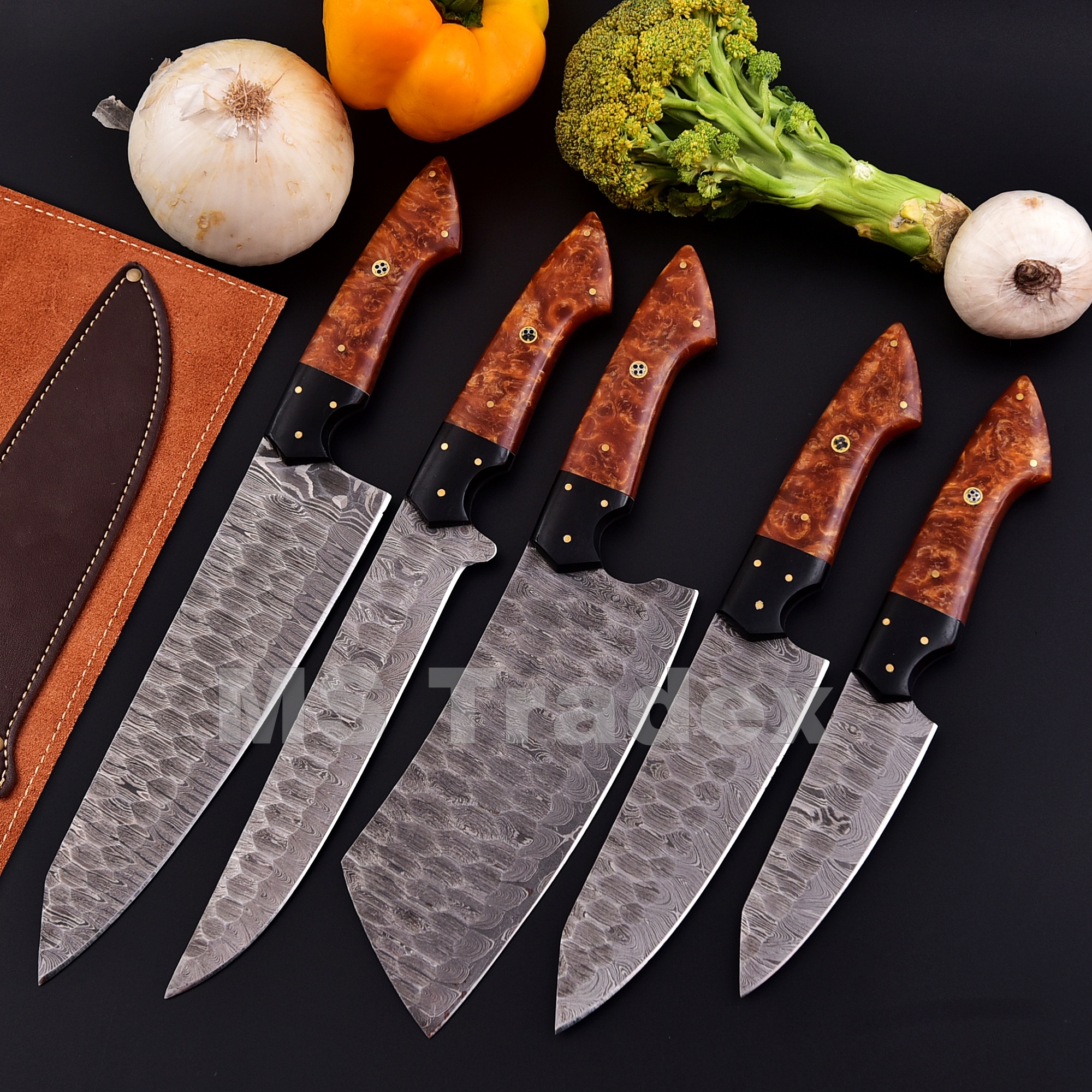 Handmade 5-Piece Damascus Steel Chef Knife Set – “Golden Burl” Amber Resin Handle with Leather Sheath