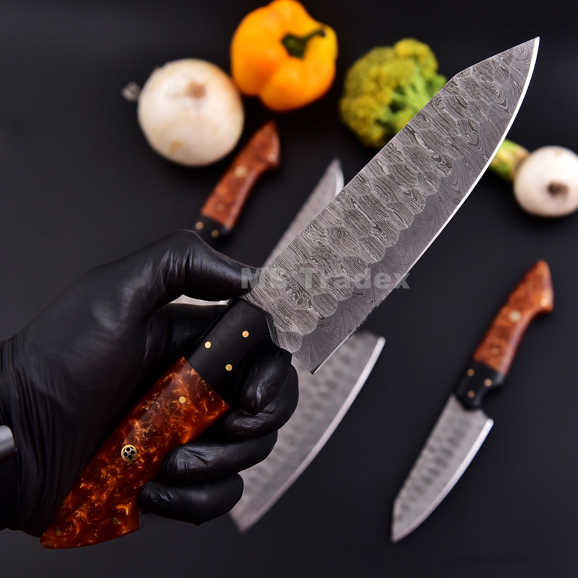 The Elegance of Nature with Modern Durability Elevate your culinary toolkit with the “Golden Burl” Damascus collection. Each blade is hand-forged to create a high-contrast wavy pattern and a razor-sharp edge. The handles are crafted from high-performance resin, specifically designed to showcase the deep, multi-dimensional swirls and “eye” patterns found in rare wood burls, but with the moisture-resistant benefits of a high-gloss composite.