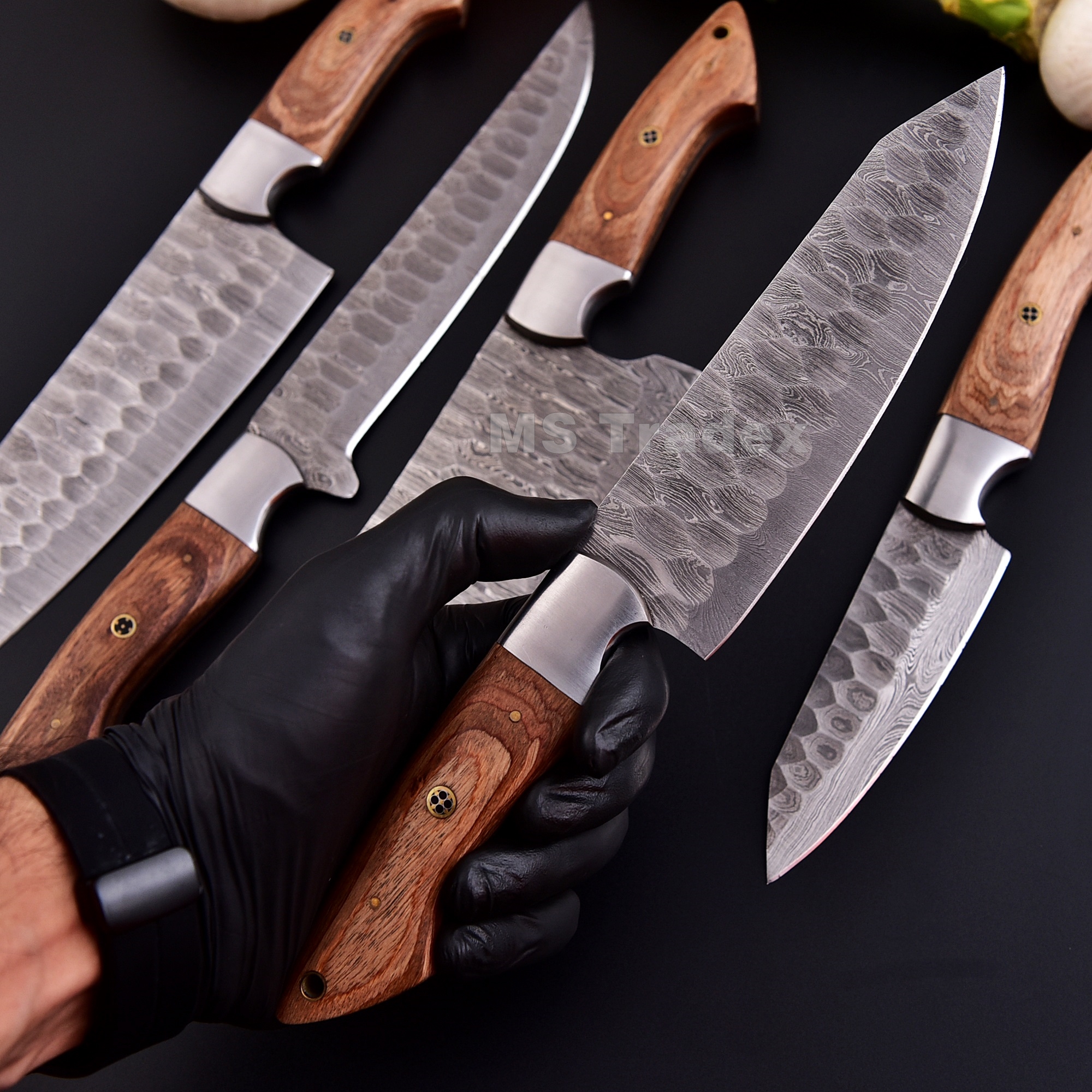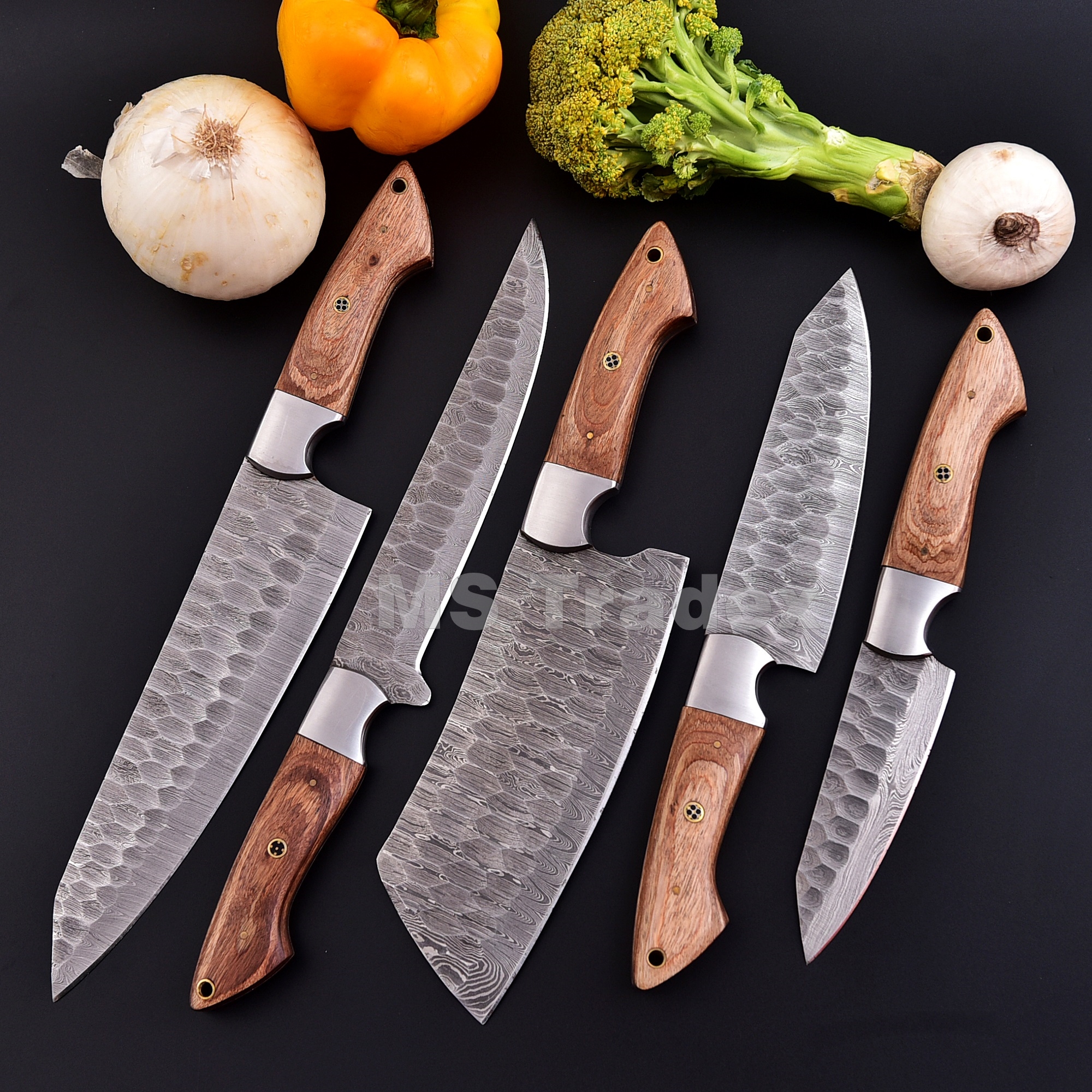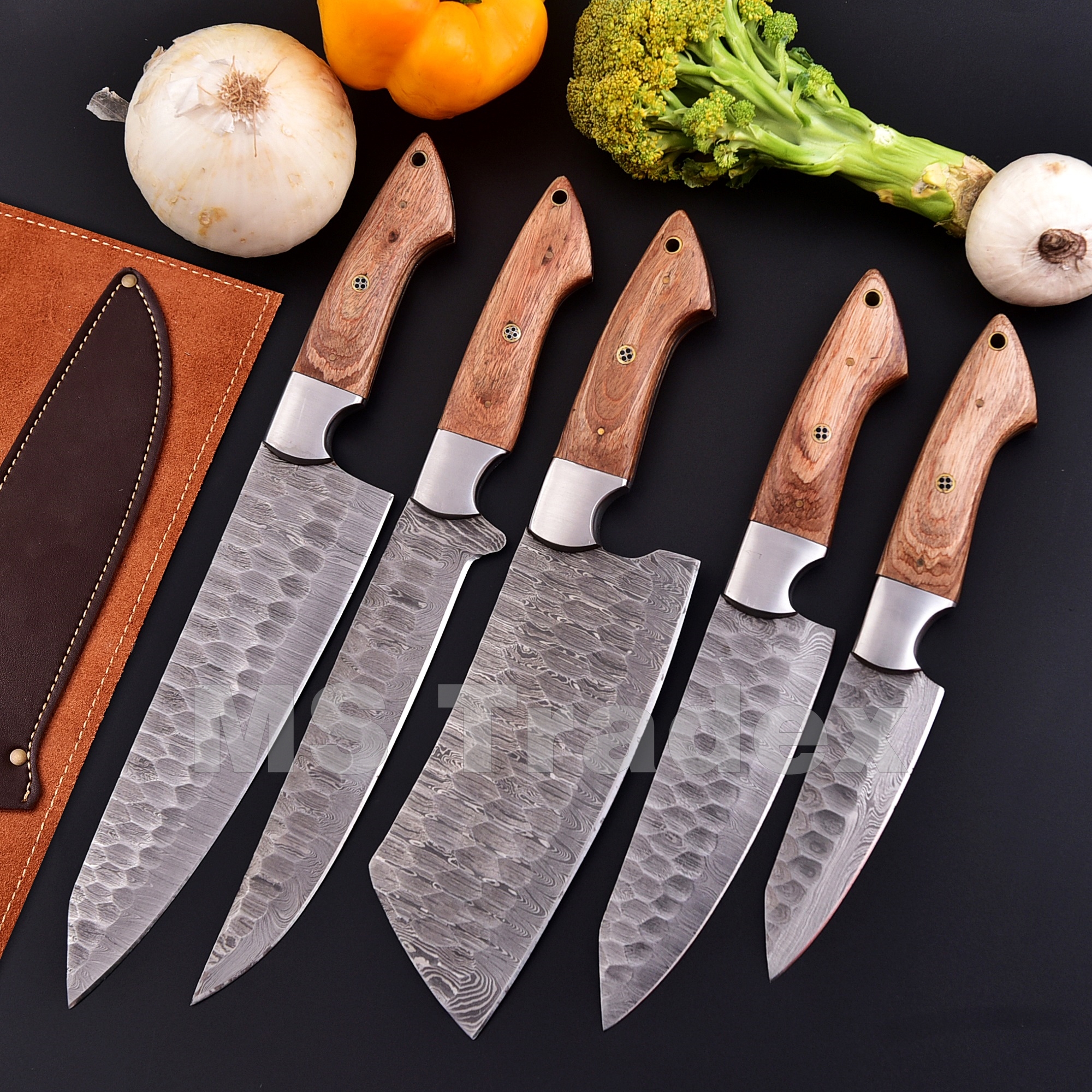 Classic craftsmanship for the heart of your home. This 5-piece professional kitchen set features hand-forged Damascus steel blades with a signature hammered texture and ergonomic natural walnut-toned wood handles. Designed for timeless elegance and high-performance utility, this set includes a custom-fitted leather sheath for safe storage.