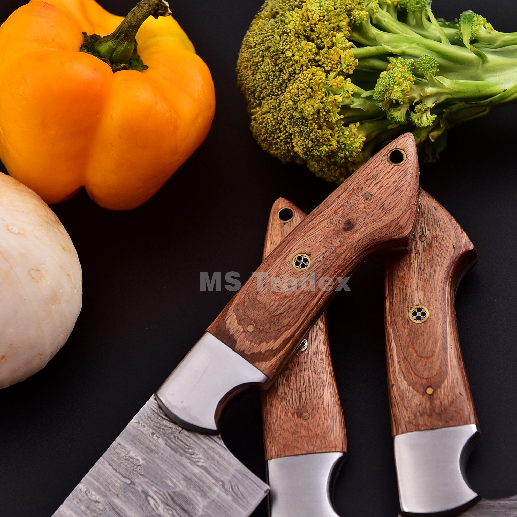 Rustic Charm Meets Forged Precision Bring the warmth of natural materials to your culinary prep with this “Walnut Grain” Damascus collection. Each blade is hand-forged to a razor-sharp edge, showcasing a stunning high-contrast wavy pattern. The natural wood handles are contoured for a comfortable grip, making them a reliable choice for long hours in the kitchen.