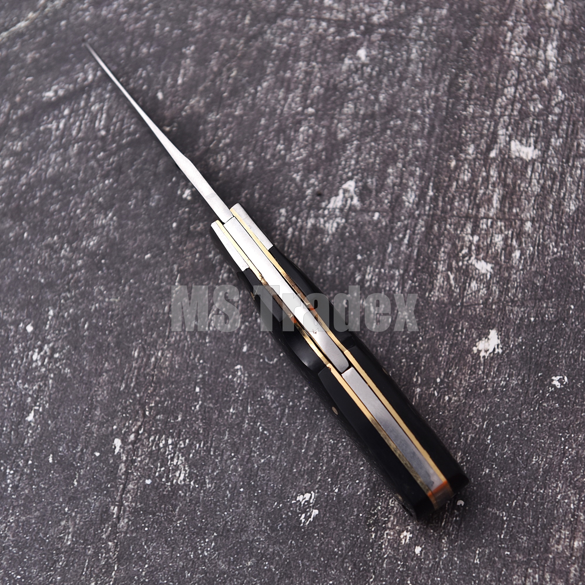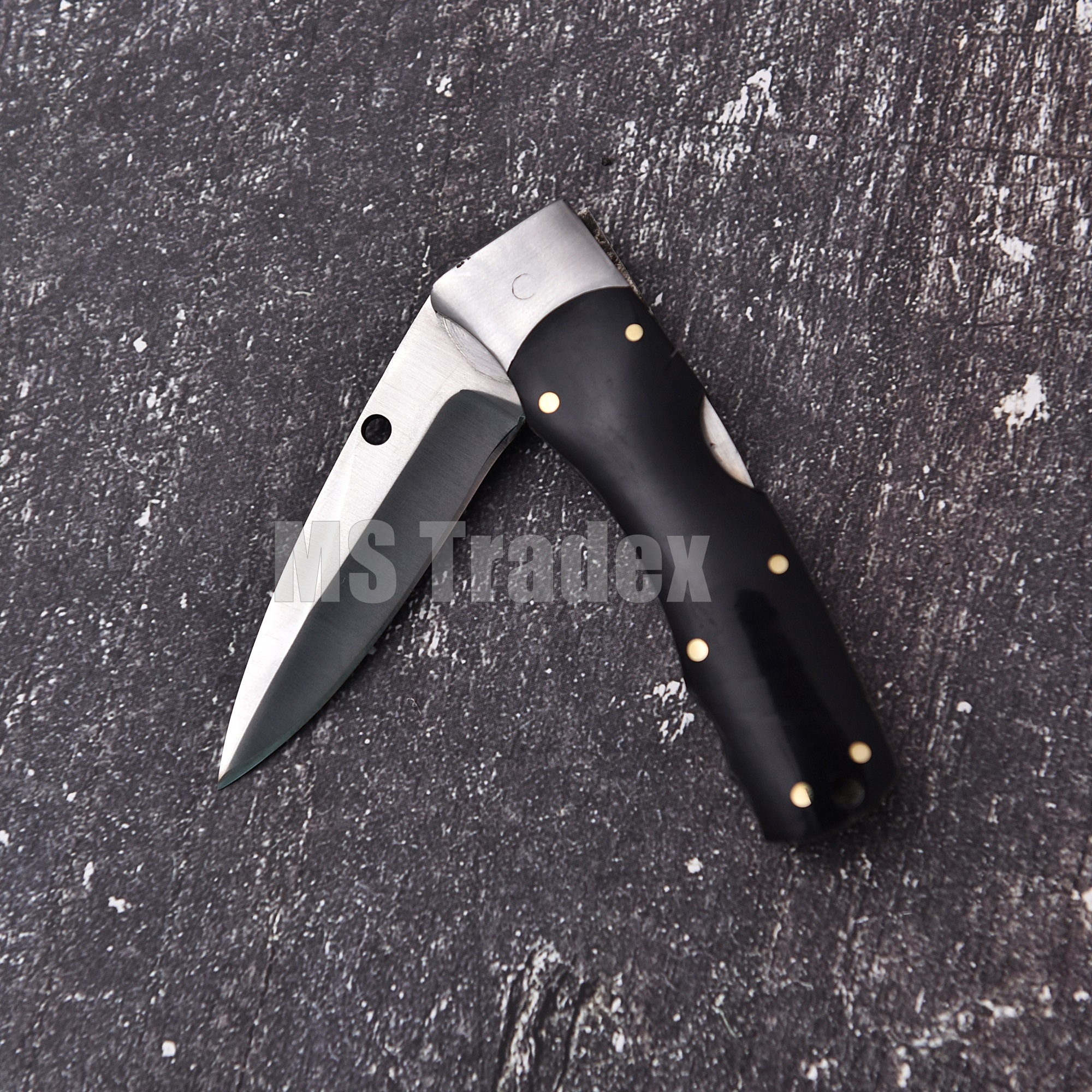 Sophistication Meets Utility This handcrafted folding knife is designed for those who appreciate minimalist elegance and superior craftsmanship. The deep black handle—reminiscent of polished Buffalo Horn—provides a smooth, comfortable grip that feels substantial in the hand, while the brass hardware adds a touch of warmth and vintage charm.