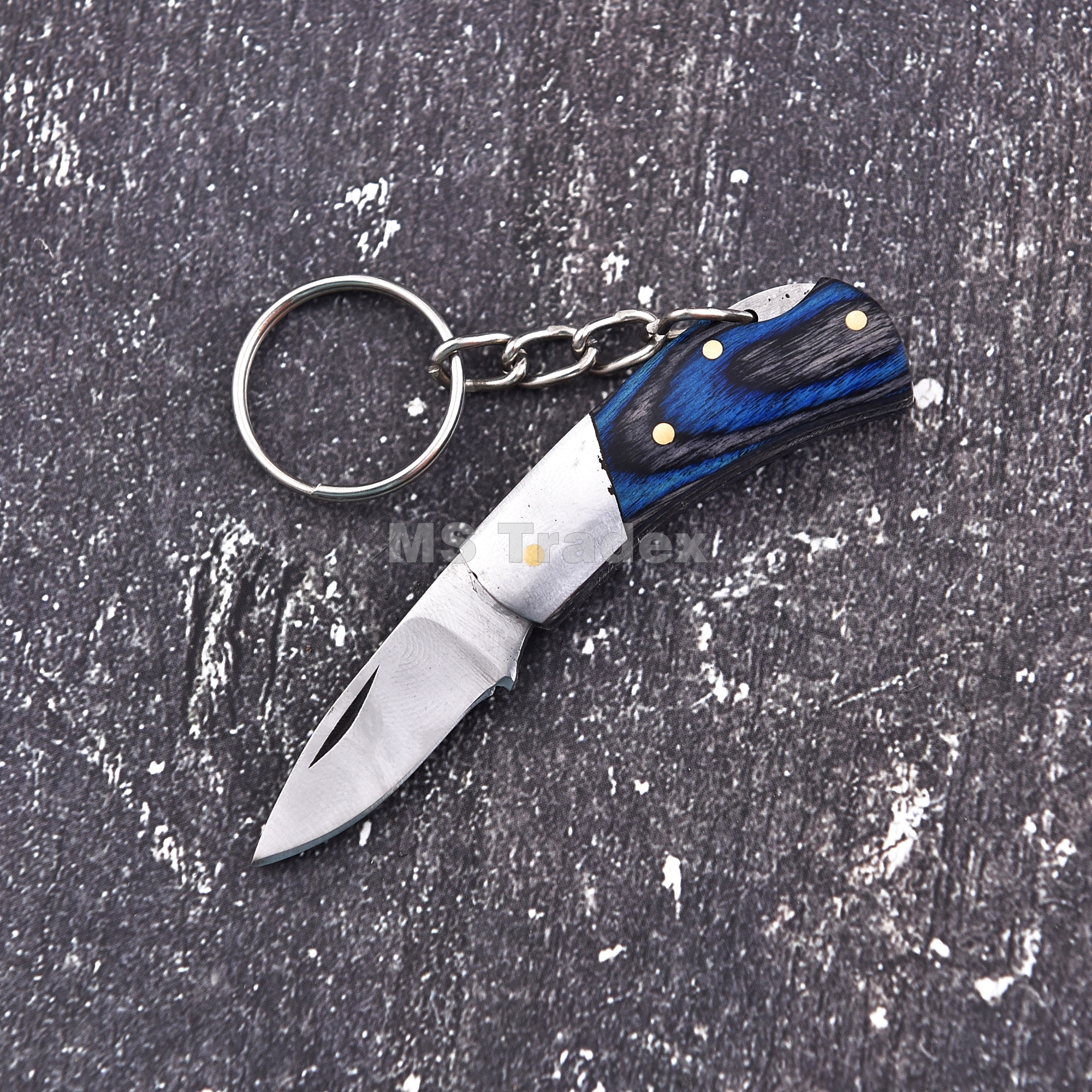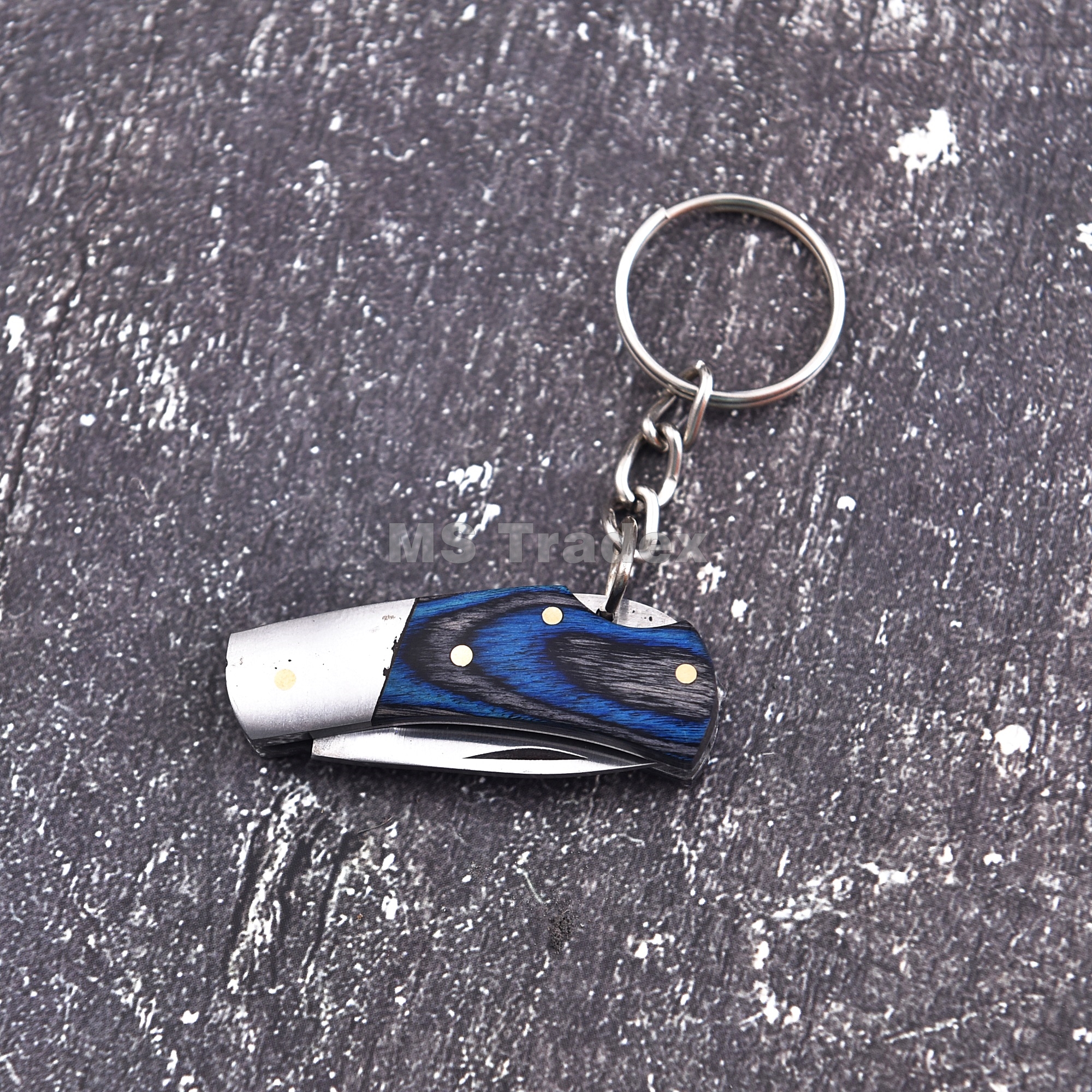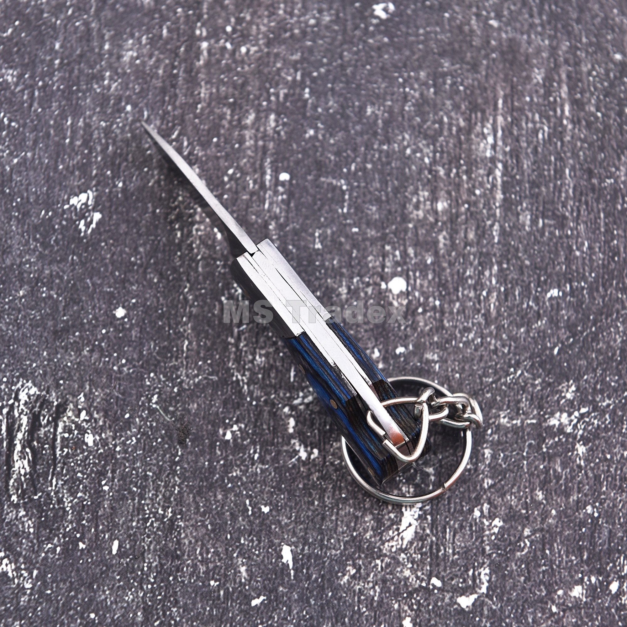 Artisan style in a pocket-sized form. This handmade miniature folding knife features a striking blue and charcoal-layered pakkawood handle and a functional stainless steel blade. Attached to a heavy-duty keyring, it is the perfect blend of tactical aesthetic and everyday convenience.