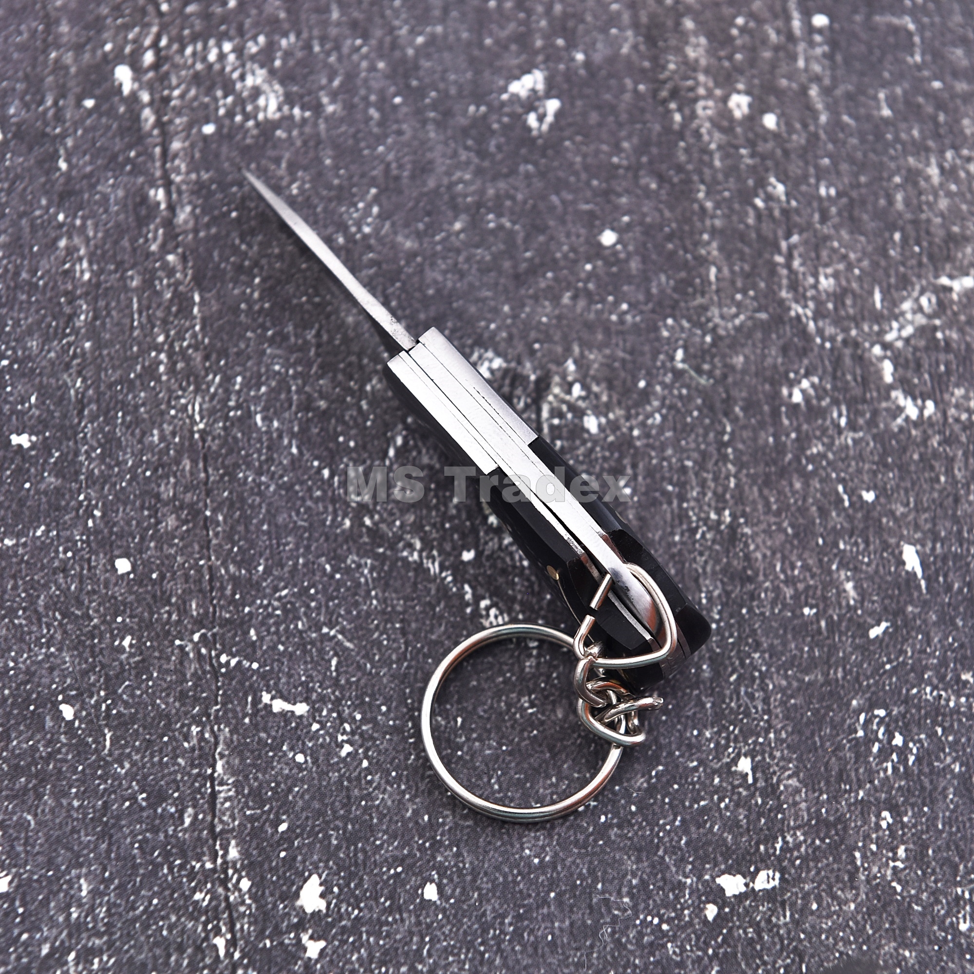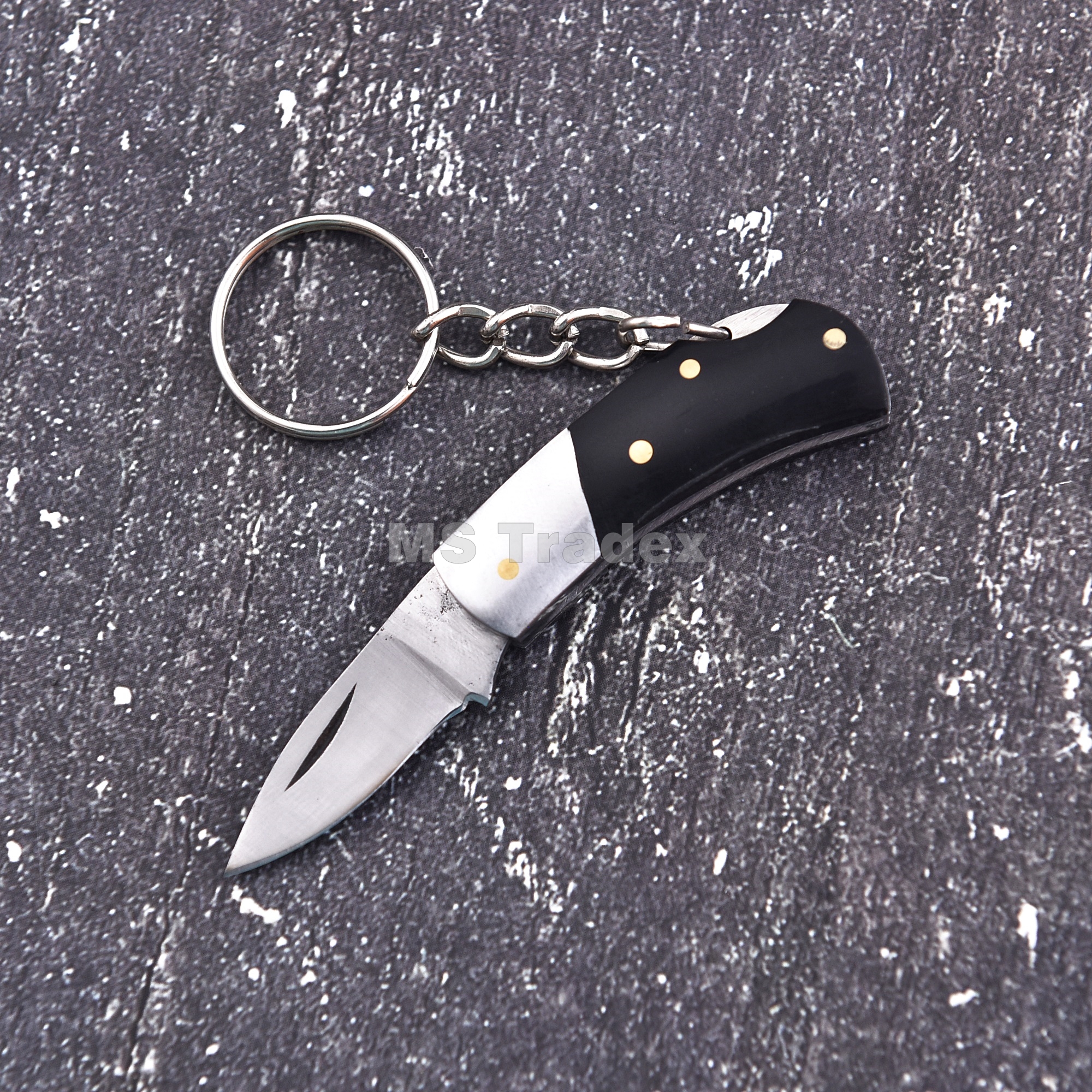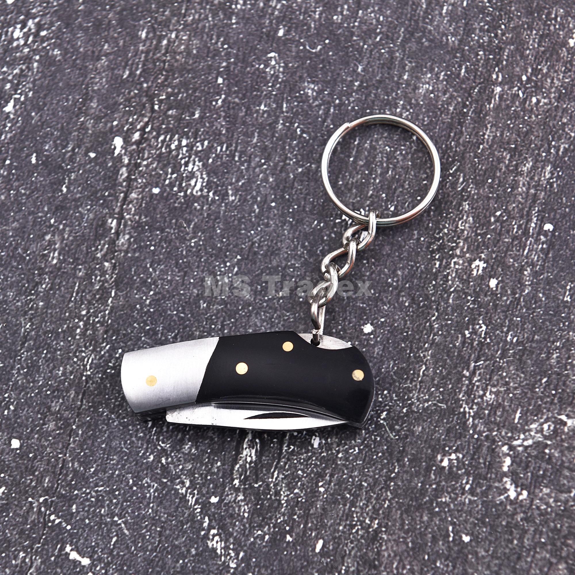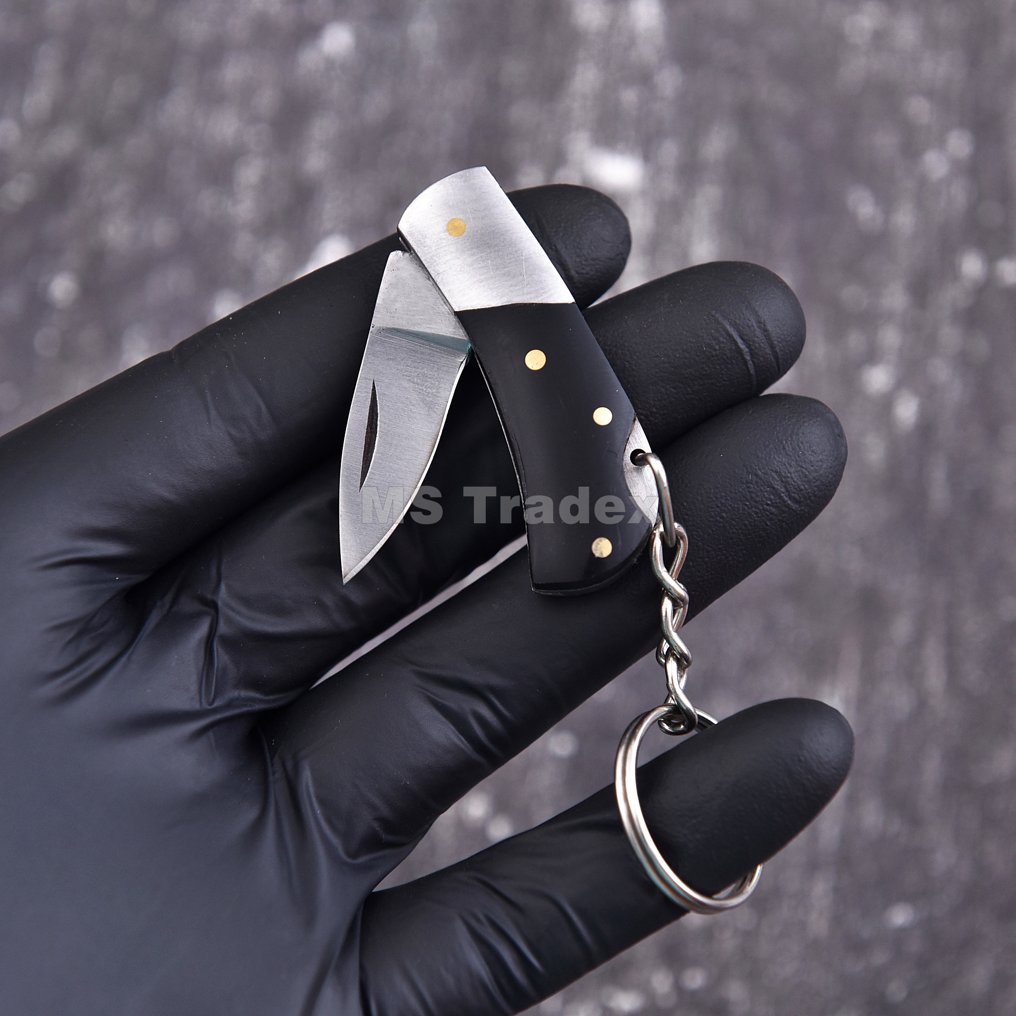 Handmade Miniature Folding Knife Keychain – Polished Black Horn Handle with Stainless Bolster