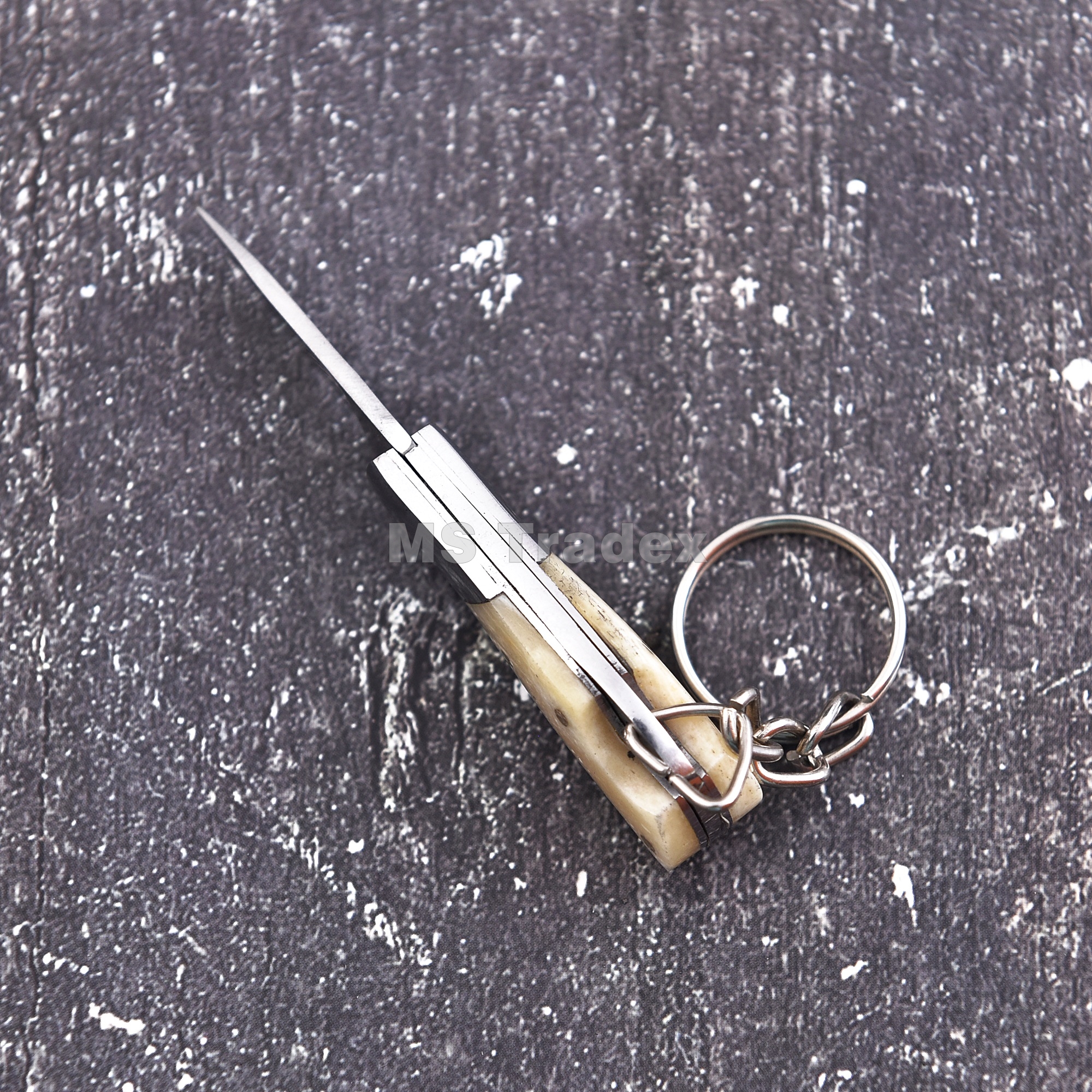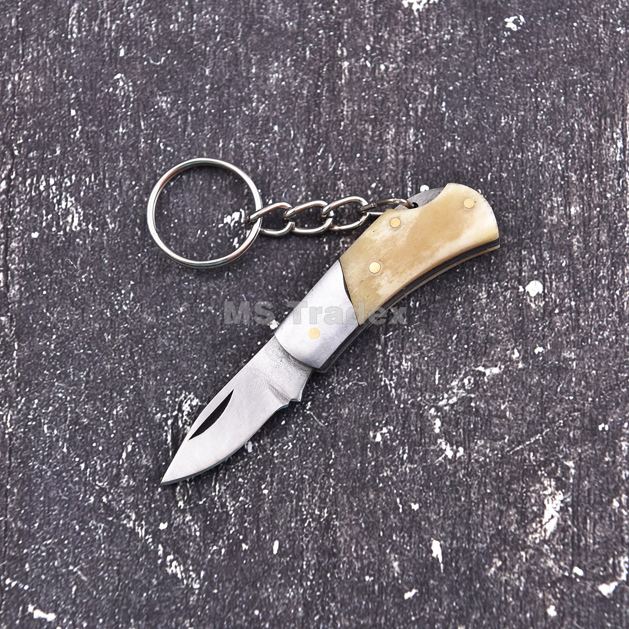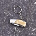 Be the first to review “Handmade Miniature Folding Knife Keychain – Polished Tan Bone Handle with Stainless Bolster”